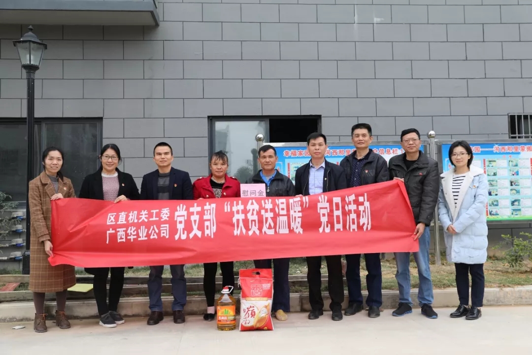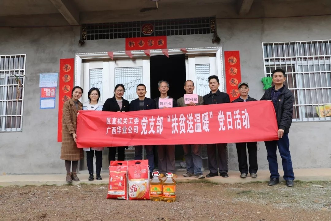 為充分發(fā)揮黨建引領作用,扎實有效推進精準脫貧工作,2019年1月15日防城區(qū)直機關工委黨支部和廣西華業(yè)投資集團有限公司黨支部聯(lián)合深入防城區(qū)那良鎮(zhèn)開展了以 “扶貧送溫暖”為主題的黨日活動。防城區(qū)直機關工委書記許紹銳、副書記蘇良東、紀工委書記宋明雄,華業(yè)集團副總裁熊昭斐、工會主席鐘麗霞帶領兩支部多名黨員一起參加了扶貧慰問活動。