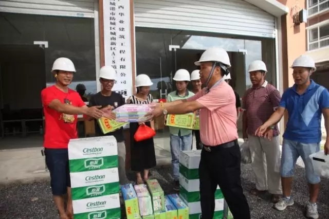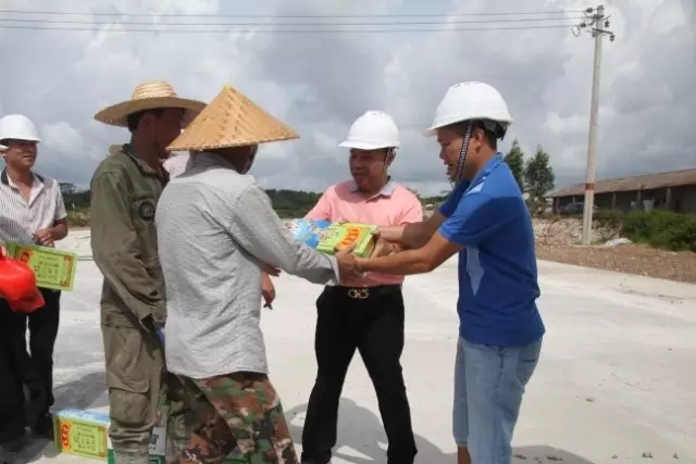 2016年8月4日,集團(tuán)總裁龍其偉、副總裁唐光源、工會(huì)主席鐘麗霞一行前往防城港市防城區(qū)城南新區(qū)A-8道路工程、防城港市和平安置區(qū)配套路網(wǎng)工程(和平北路及和平西路)工程、廣西欽州高新技術(shù)產(chǎn)業(yè)開發(fā)區(qū)B1地塊安置回建項(xiàng)目施工現(xiàn)場慰問不畏暑熱奮斗在一線項(xiàng)目部員工,并為他們送去涼茶、礦泉水、常用藥品等夏季防暑物資。