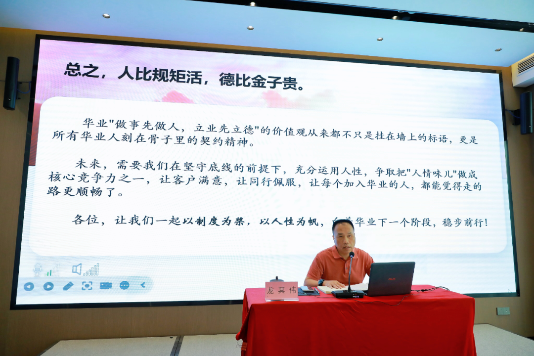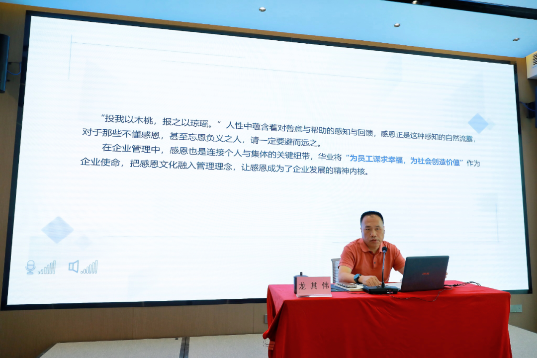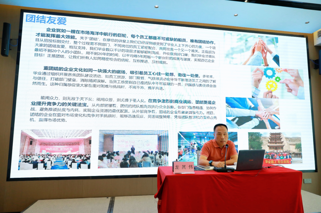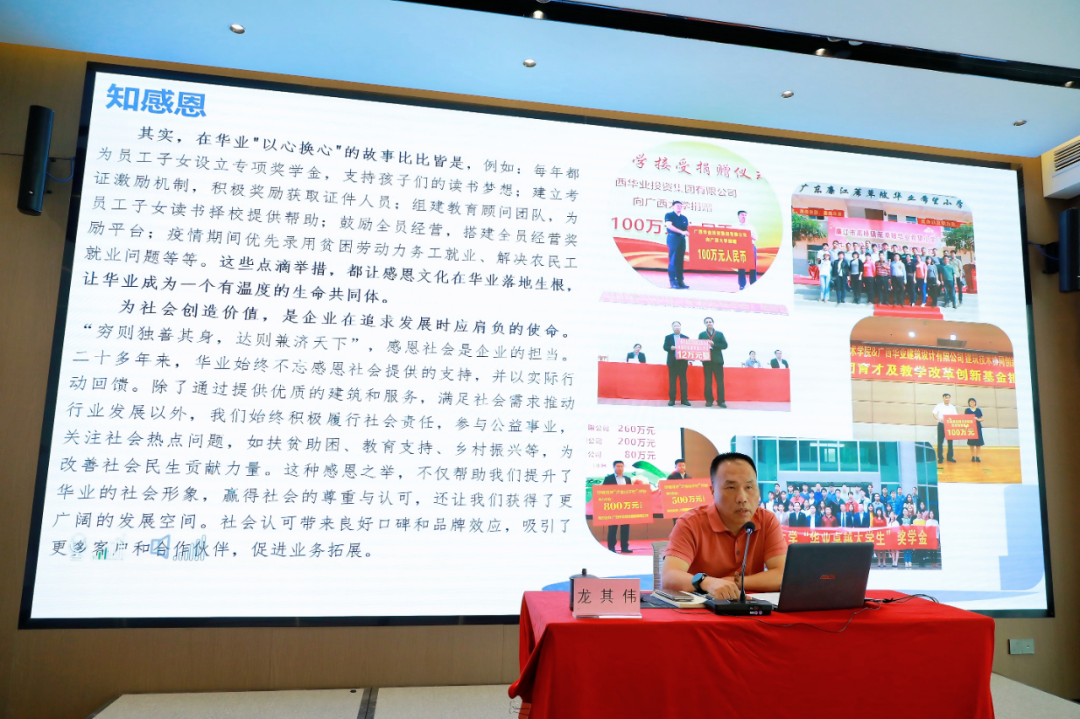 在“人性與企業(yè)管理的融合”篇章,龍其偉總裁強(qiáng)調(diào)企業(yè)管理歸根結(jié)底是對“人”的管理。他結(jié)合集團(tuán)實(shí)際,與大家分享華業(yè)如何通過“守信用、講道德、知感恩、重團(tuán)結(jié)”四大基石構(gòu)建具有華業(yè)特色的人性化管理體系。