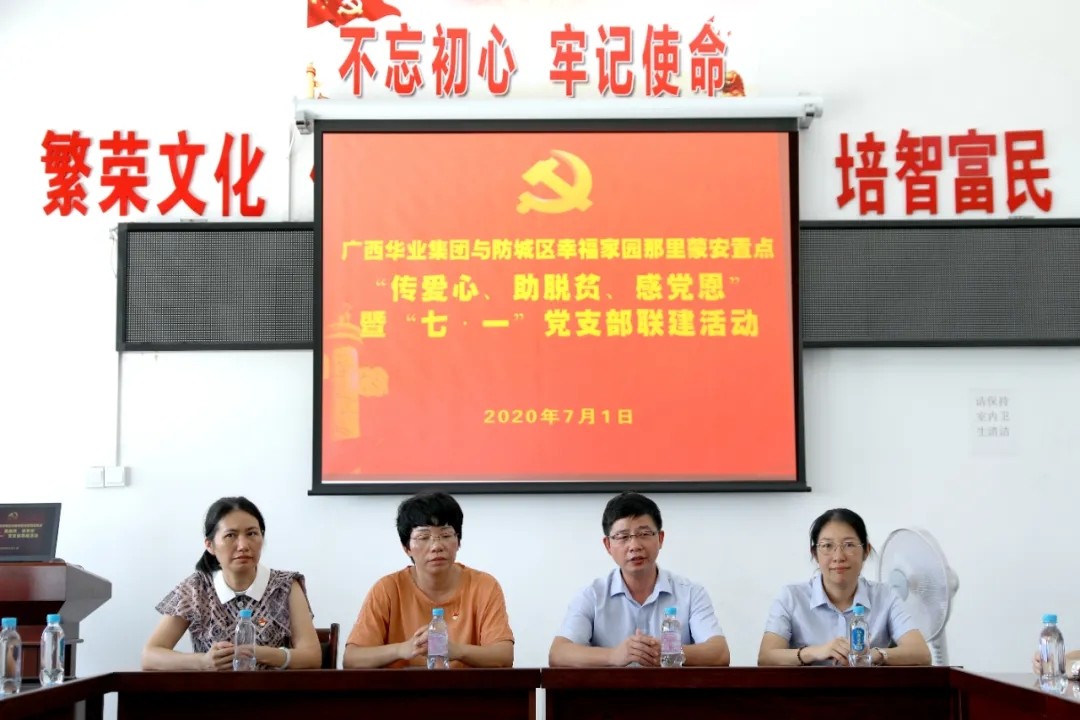 2020年7月1日建黨節(jié),廣西華業(yè)投資集團(tuán)有限公司黨支部與防城區(qū)幸福家園那里蒙安置點(diǎn)黨支部開展主題為“傳愛心·助脫貧·感黨恩”暨“七·一”支部聯(lián)建活動(dòng)。活動(dòng)通過聯(lián)建座談、慰問那里蒙安置點(diǎn)困難老黨員及捐贈(zèng)課桌椅等方式開展。